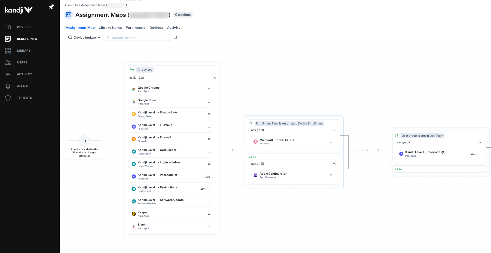 デバイスの状況に応じて自動的にポリシーや設定を割り当てる機能です。IT管理者は、デバイスの属性やユーザーの役割に基づいて異なる設定を定義できます。さらにKandjiでは、デバイス情報だけでなく、ユーザー部門やタグ別などの条件も設定できるため、特定の状況に応じた柔軟なポリシー管理が可能になります。
