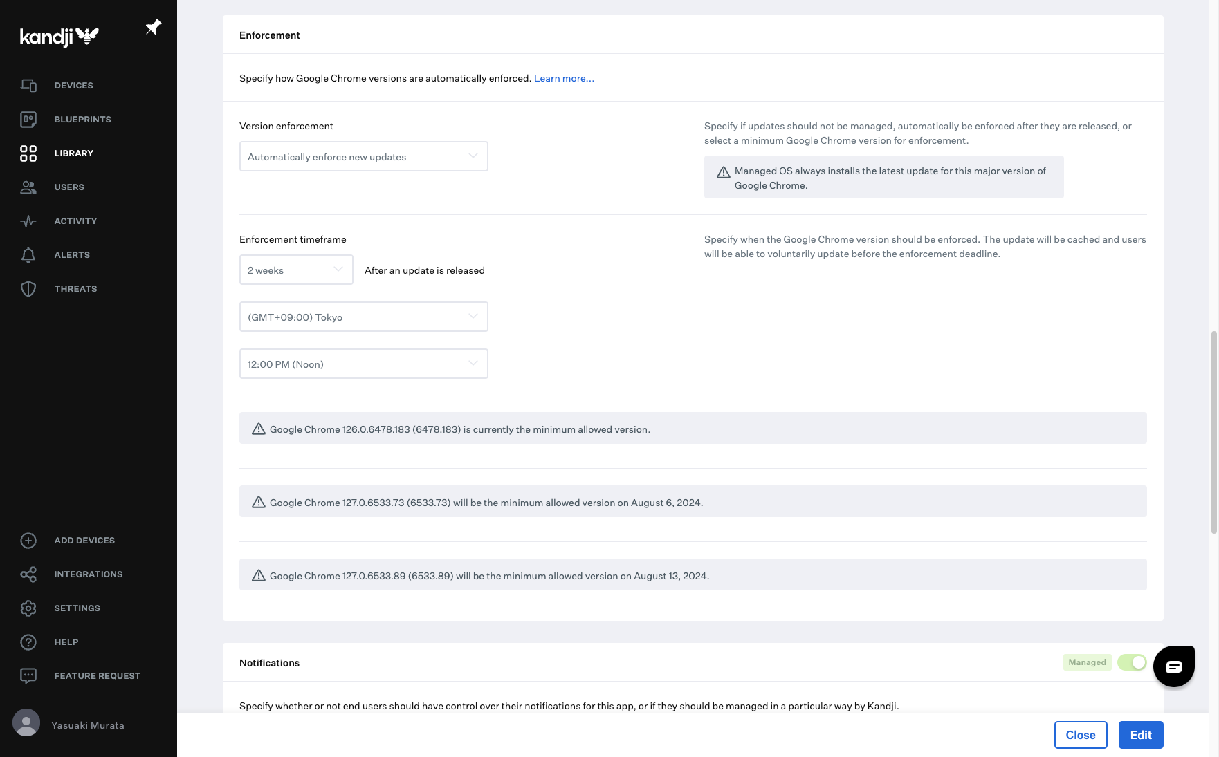 Kandjiでは、OSの管理や更新する機能に加えて、他のMDMではスクリプト(Nudgeなど)を使用しなければならない強制インストールも標準機能として提供しているため、利用者に簡単にOSの更新を促すことができます。これにより、常に最新の機能とセキュリティパッチが適用され、デバイスの安全性が確保されます。