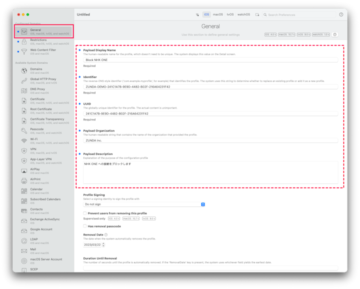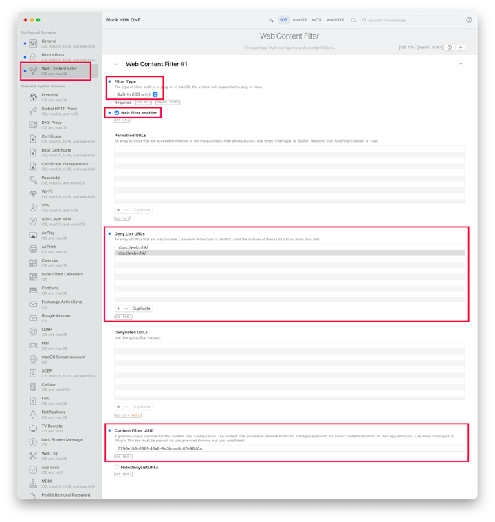 - iOS 16 以降にインストールする場合は「Content Filter UUID」が必要です。適当に生成した UUID 文字列を入れてください。