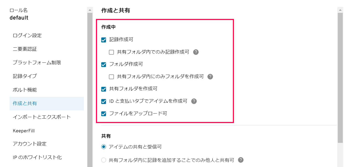 共有権限については「記録とフォルダの共有を禁止」という設定項目しか存在せず、それを有効にすると、以下の権限もなくなりました。