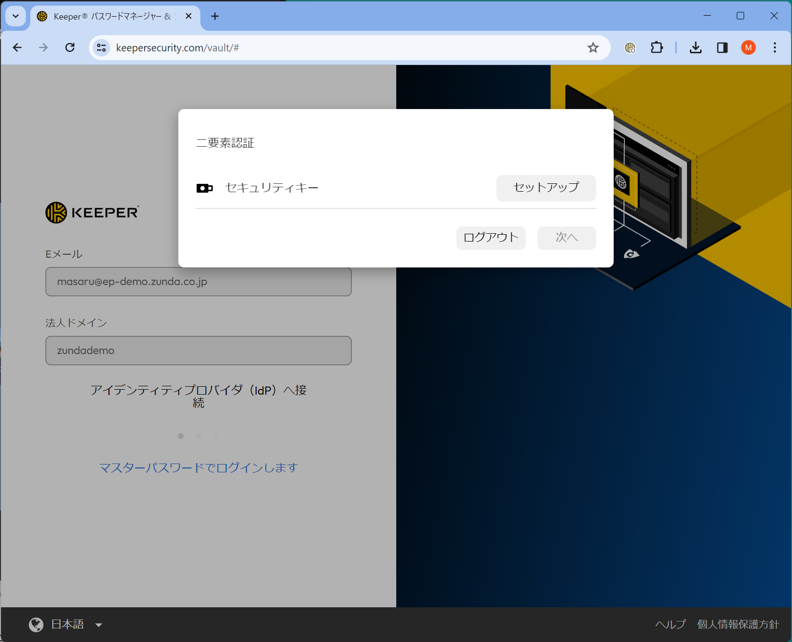 このポリシーを有効にした後ログインしてみると、このように「セキュリティキー」の設定が求められます。