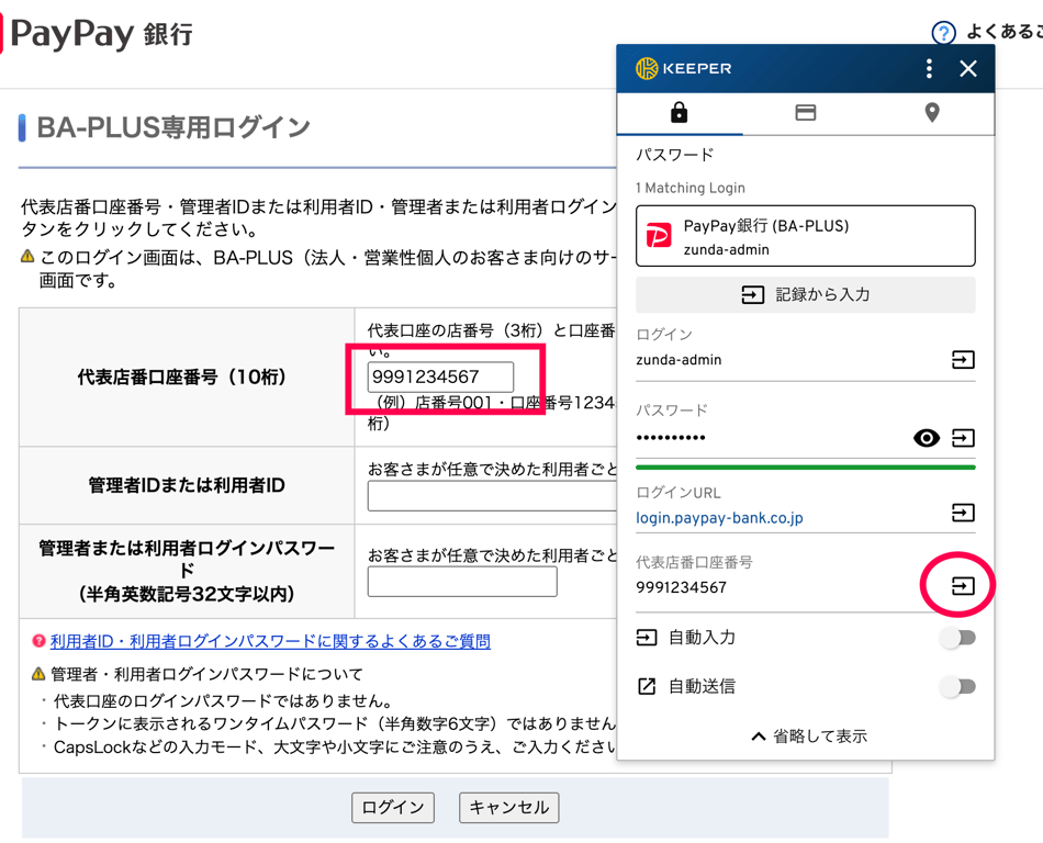 サイト訪問時に表示される Keeper のポップアップ画面で追加したカスタムフィールドも確認できます。該当するフォームにカーソルを合わせて入力ボタンを押すことで、その値を入力できます。