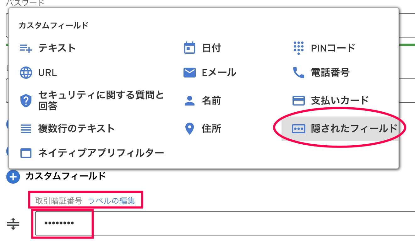 なかにはパスワードが複数あるサイトもあります。例えば多くの銀行では「ログインパスワード」と「取引パスワード」があったりしますね。こういうときは「隠されたフィールド」を選んで記憶させましょう。