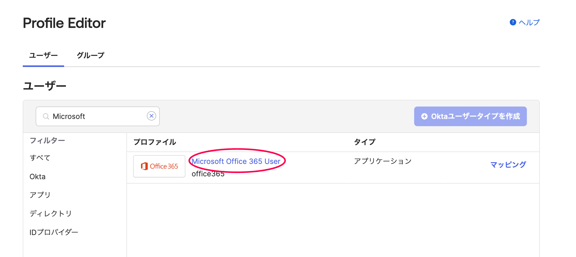 Okta Admin Console > Profile Editorで Microsoft Office 365 User を開きます。