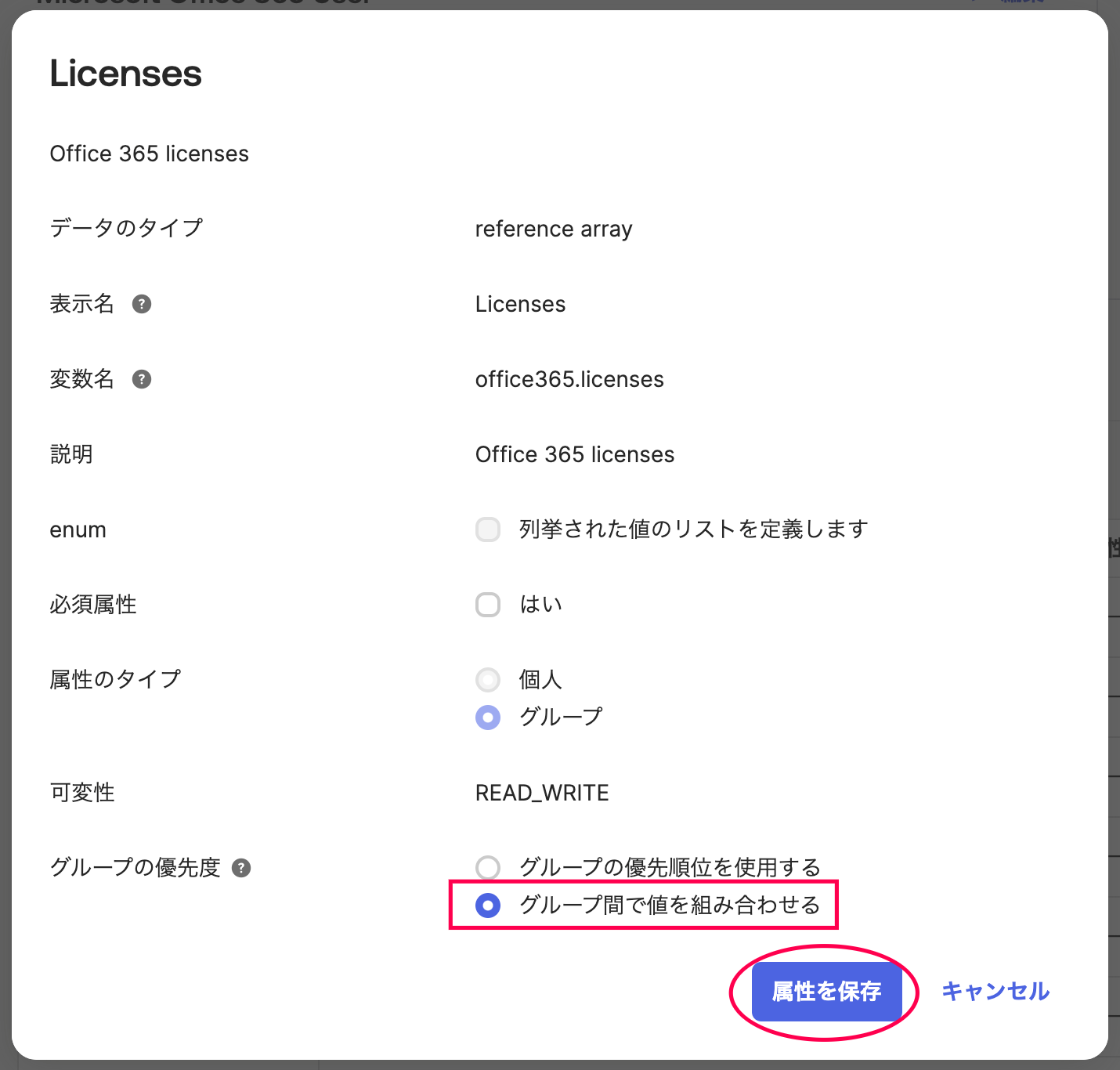 Group Priority がデフォルトでは Use Group Priority となっていますが、Combine values across groups に変更し、Save Attribute を押します。