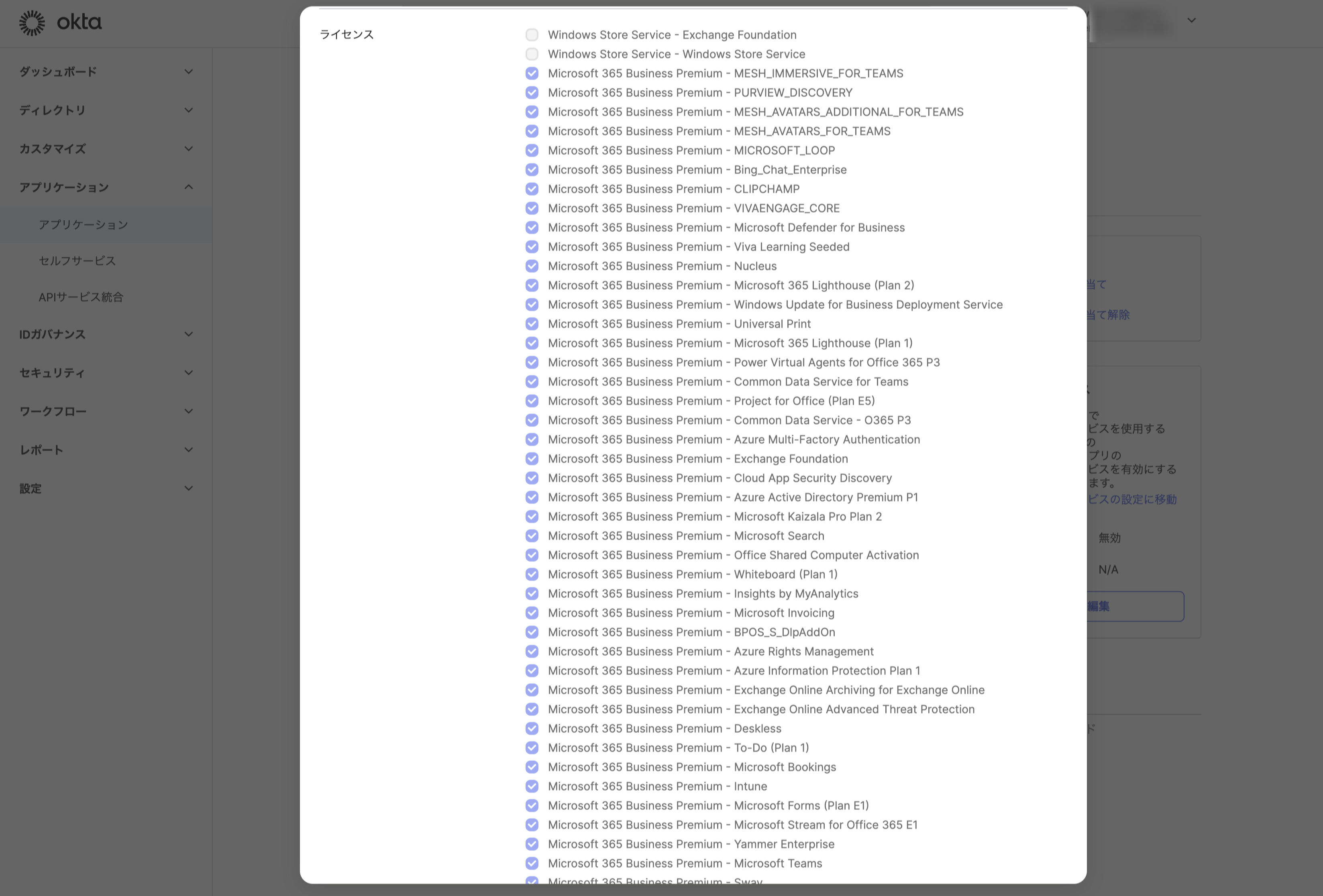 Okta からユーザーに対して Entra のライセンスを付与する場合、下のような画面から必要なライセンスを選ぶ必要があります。