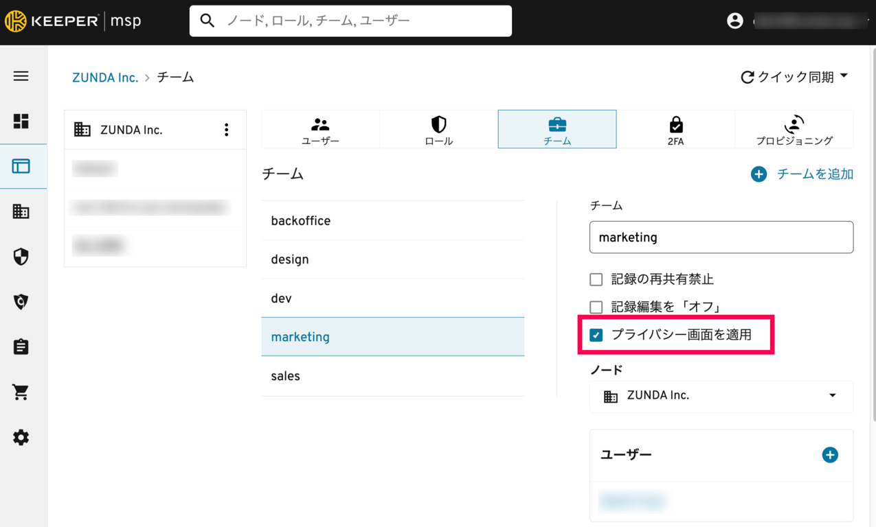 チームに対して伏字の設定を行う場合、管理画面から「管理者」 > 「チーム」タブを選択し、設定を施したいチームを選択します。チームの設定メニューが右に表示されるので、その中から「プライバシー画面を適用」を選択します。