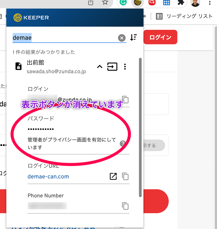 こちらの画像は先ほどのウェブサイトと同じですが、パスワードを表示することができません。これはKeeperの管理画面で、特定のチームの設定を編集したり、特定のドメインでのパスワード表示を禁止するロールを作成することで可能です。