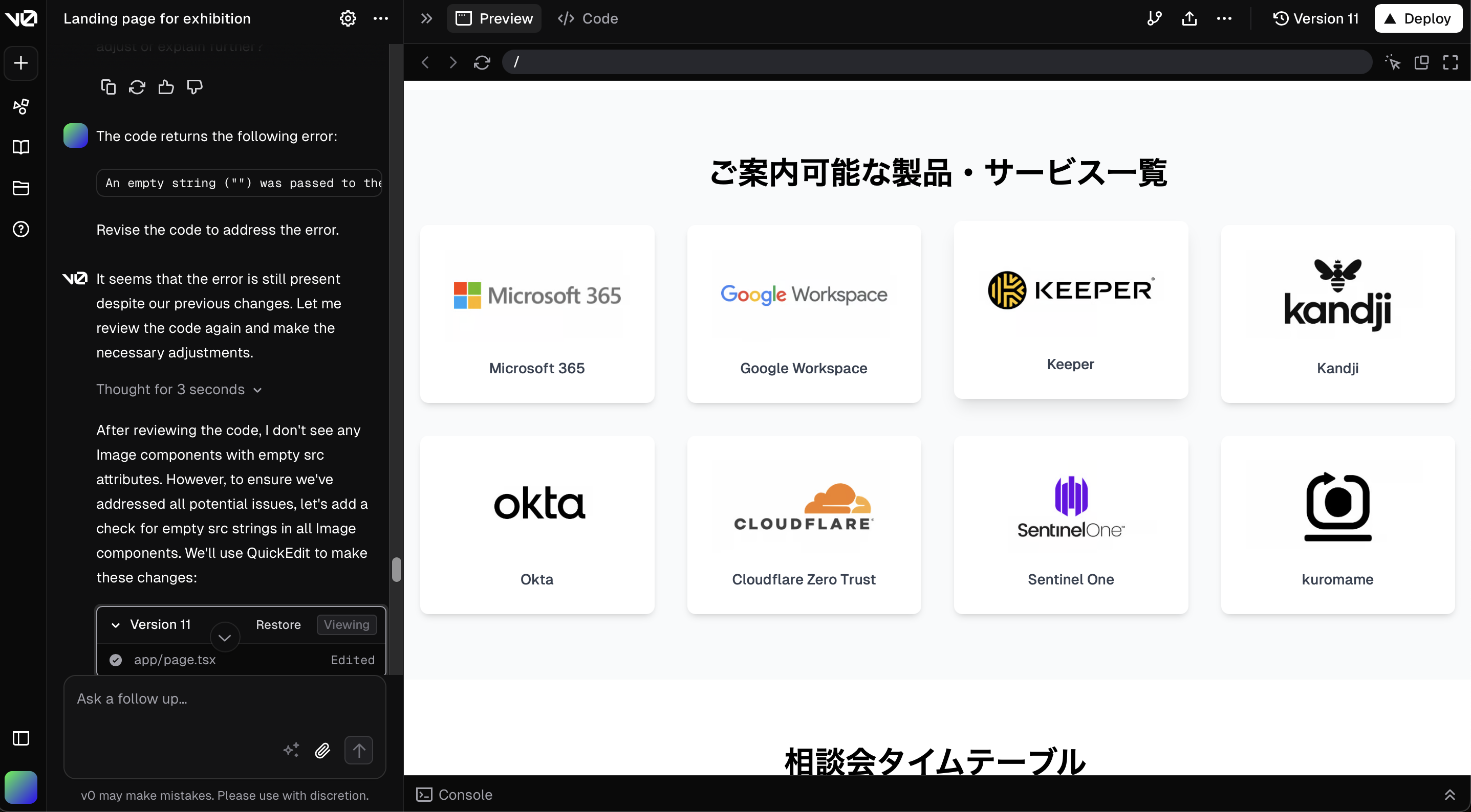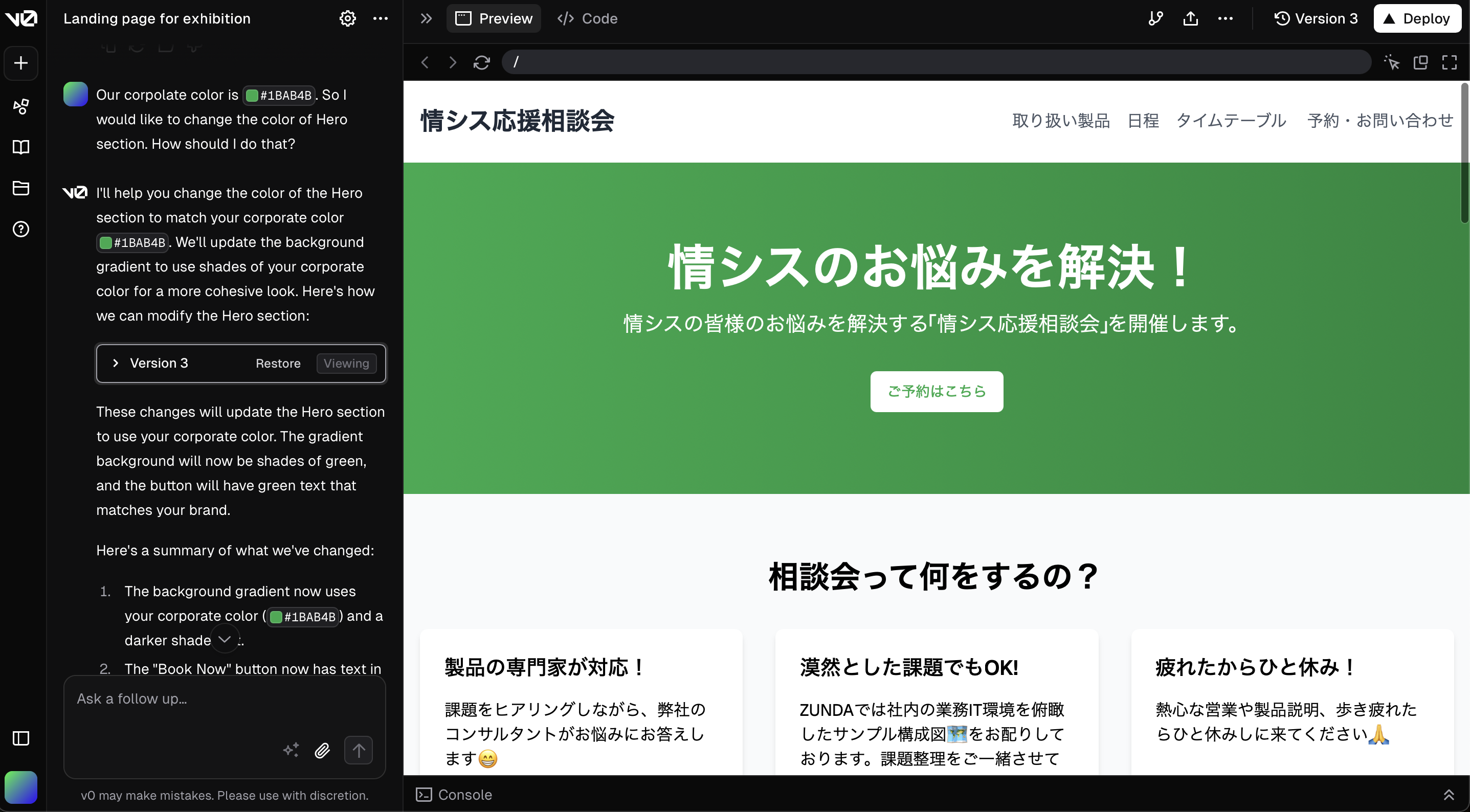 ZUNDAでは「Japan IT Week 春 2025」の「情シス応援パビリオン」に出展し、無料相談会を開催予定です。この告知用LPを作成するため、「v0」という生成AIサービスを利用しました。