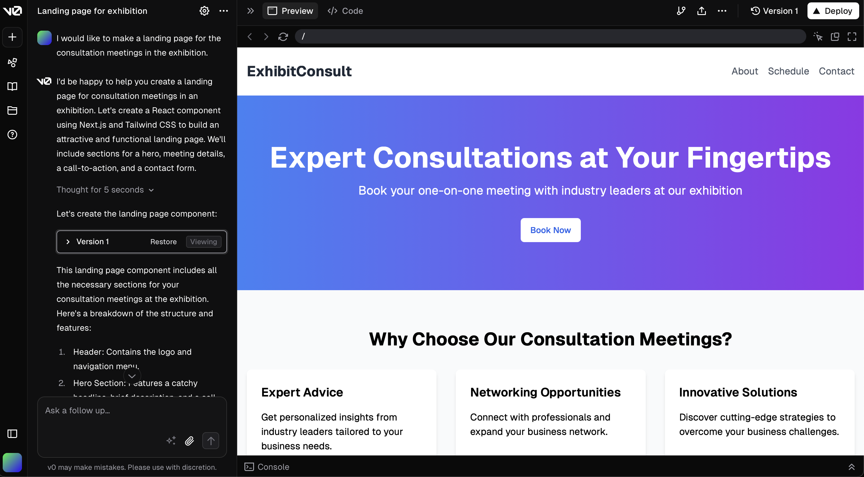 v0は英語圏のプロダクトなので英語でプロンプトを入力しました。(日本語でのプロンプトも可能です)最初は提供した情報が限られていたものの、初期アウトプットとしては十分なものが得られました。