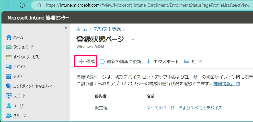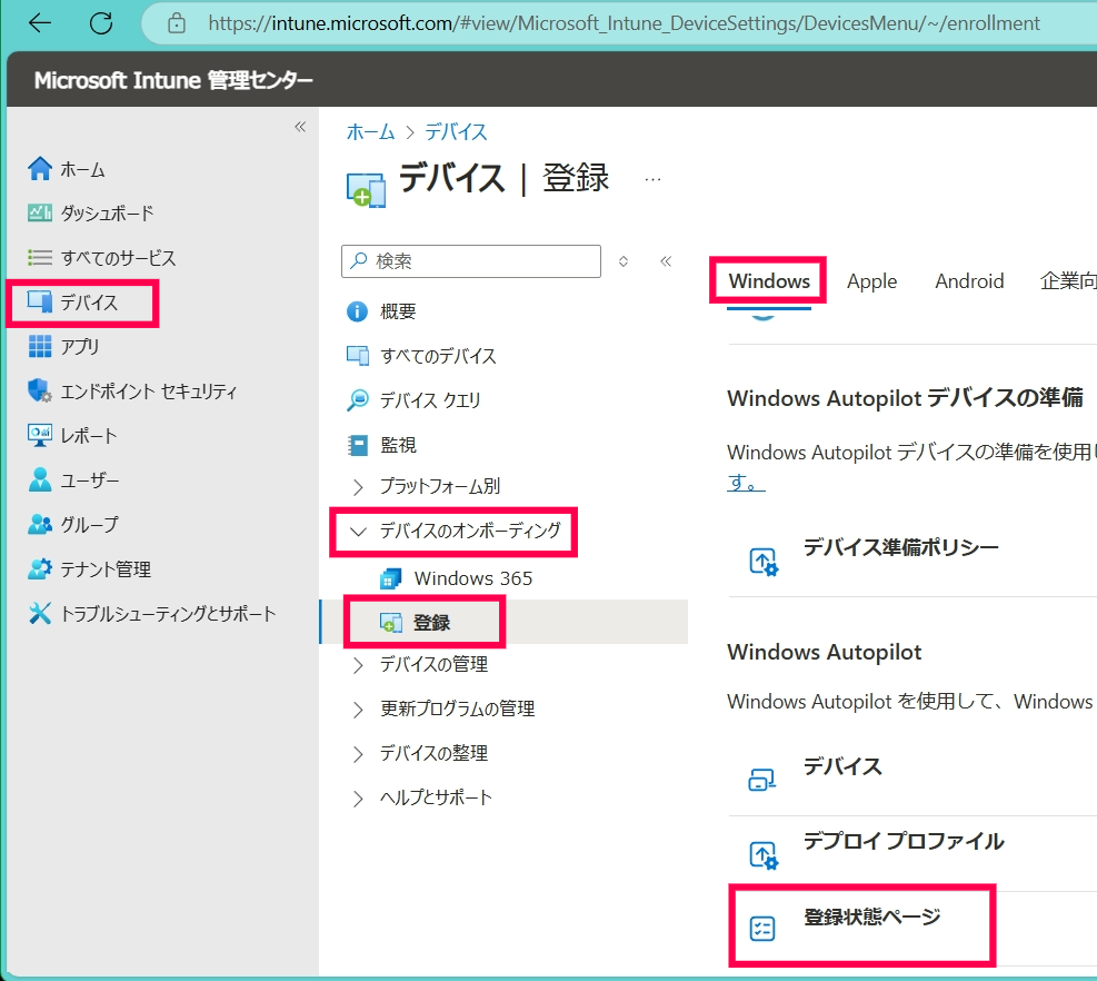 - Windows タブ > Windows Autopilot > 登録状態ページ を開きます