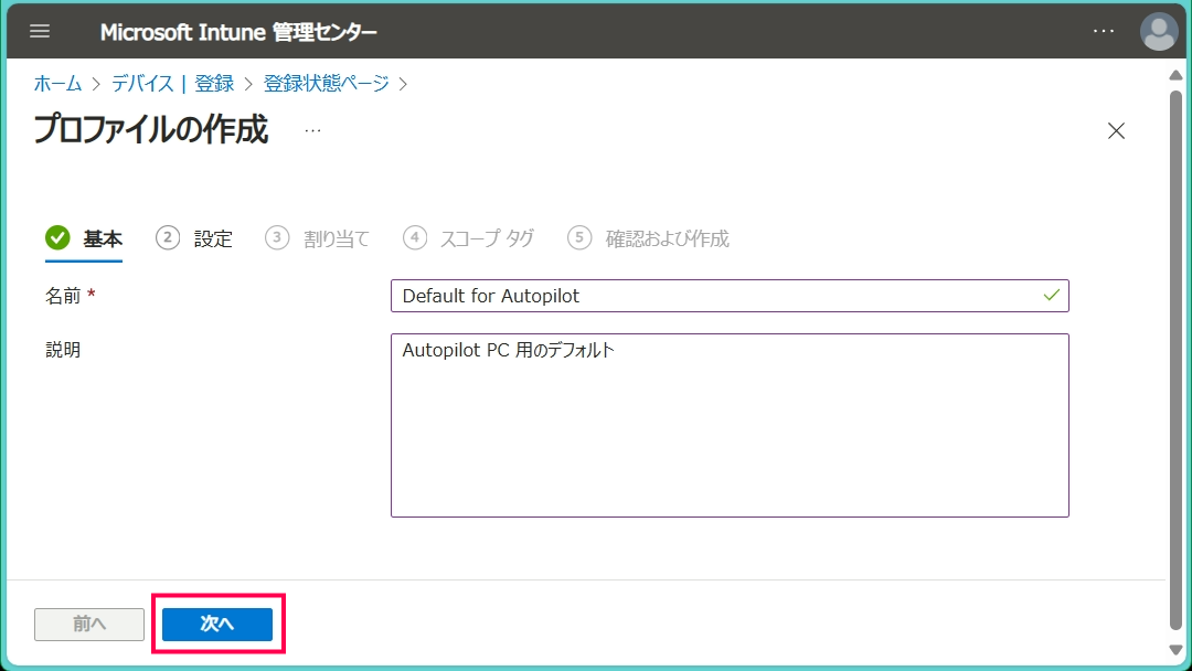 ※規定値で『すべてのユーザーおよびデバイス』が表示されていますが、こちらはそのままにしましょう。未設定端末の設定を変更してエラーでハマるとリカバリが大変です - 『名前』『説明』を入力し、[次へ] をクリックします