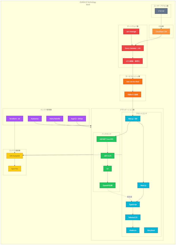 また、これらすべての構成要素は k8s の単一クラスタ内にデプロイされ、内部通信は Istio の mTLS で認証・暗号化されています。少人数チームでもセキュリティ要件を満たしつつ高い生産性を維持できるよう、安定した技術を選びながらも、運用を任せられる“少し攻めた”技術を採用しています。
