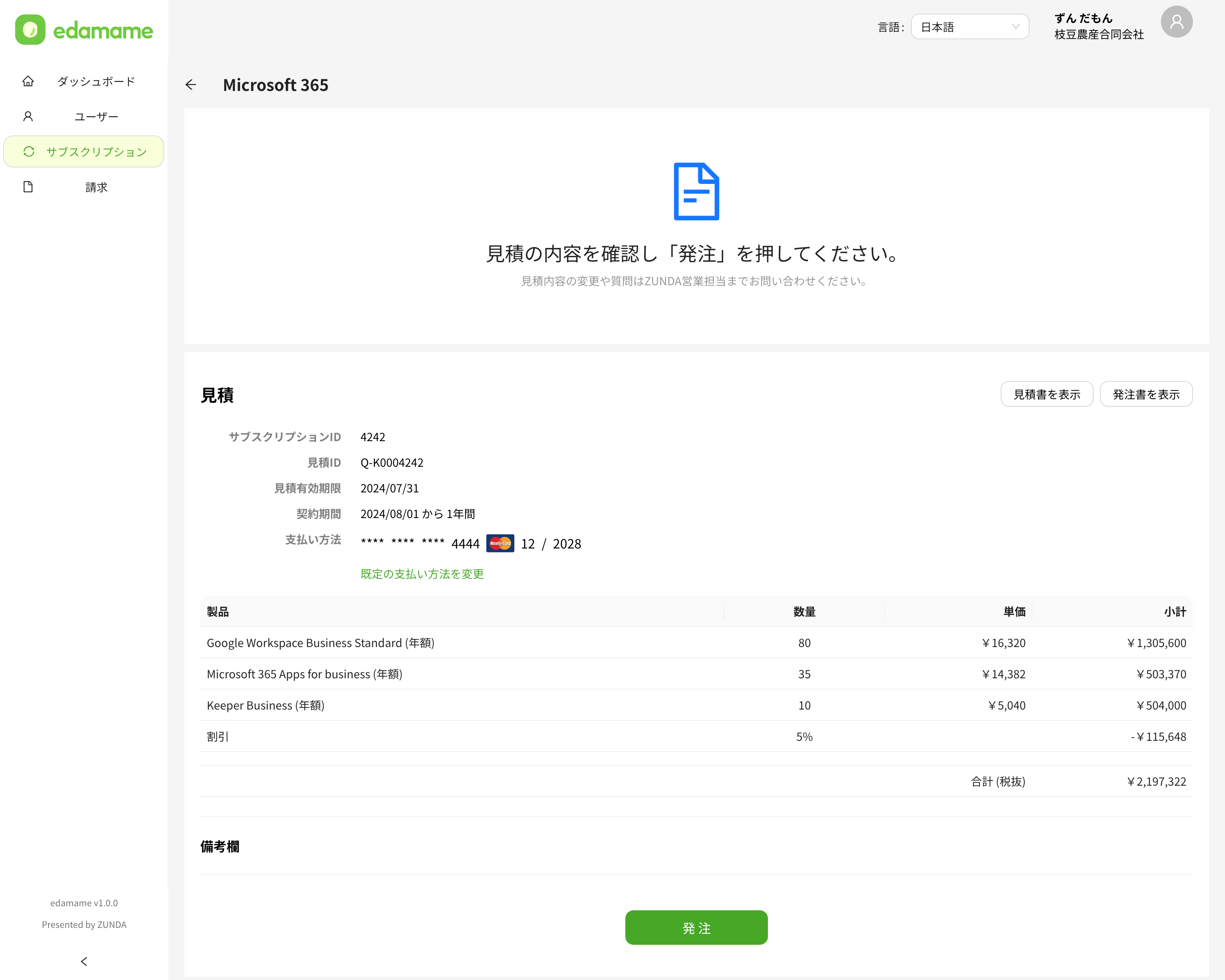 ZUNDA が提供する「edamame」は、弊社営業担当が提案した製品およびプランの確認から見積書の取得、発注承認、利用開始までの手続が完結するポータルサイトです。面倒な数量変更時の差分見積も即座に試算・取得いただくことができるほか、更新状況の把握も簡単に行なえます。