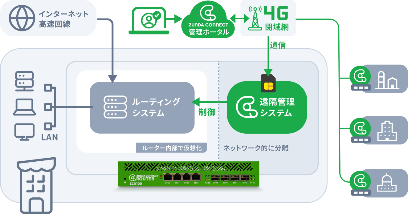 管理インターフェースやVPN機能をルーター本体から分離し、4G閉域網による管理経路の完全分離を実現。ゼロトラスト設計を推進し、セキュリティリスクを抜本的に低減します。