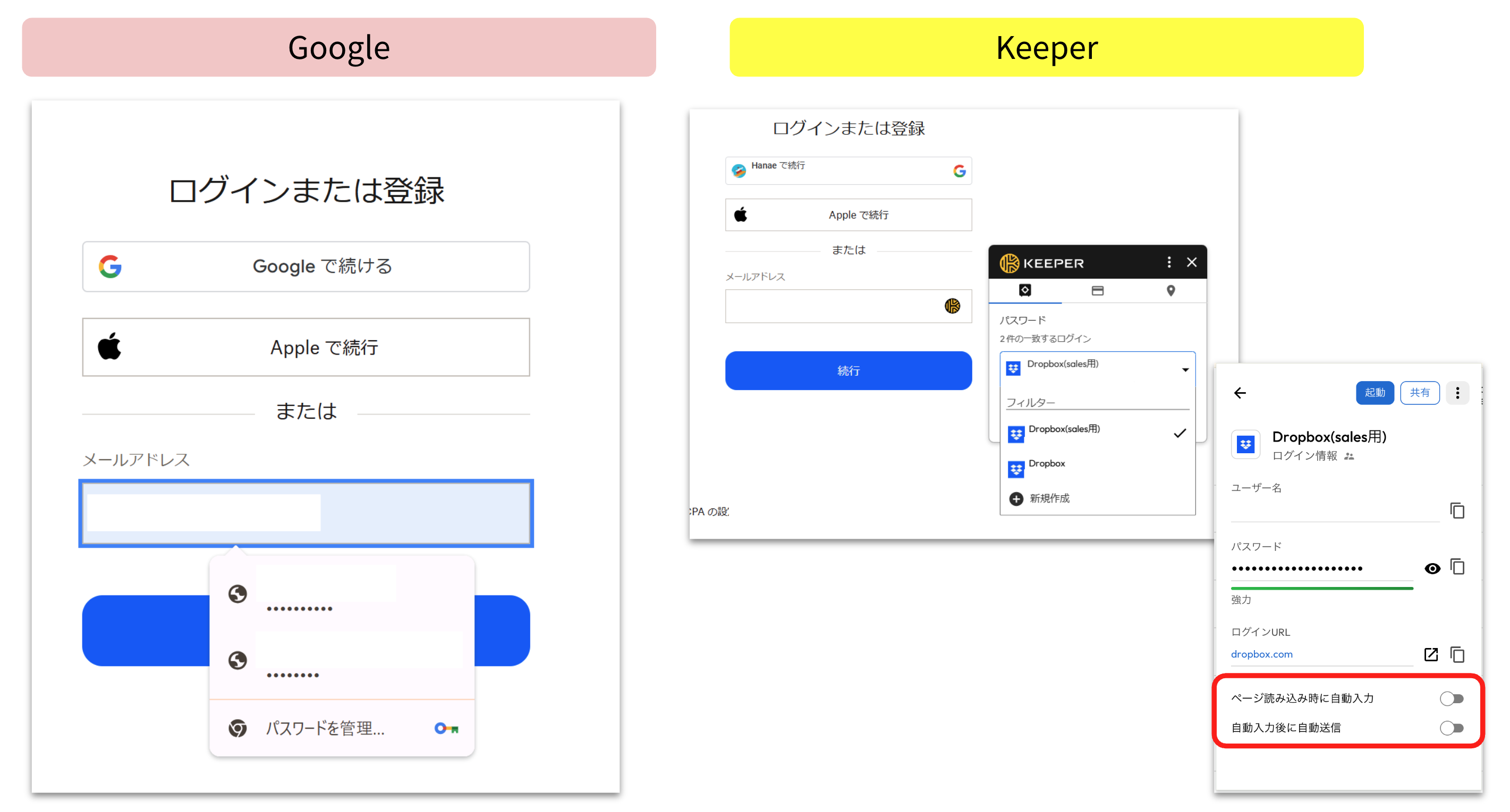 - Google も Keeper も自動入力の補助が効く。また、複数の記録を持っている場合、どちらも入力するアカウントを選択することが可能。