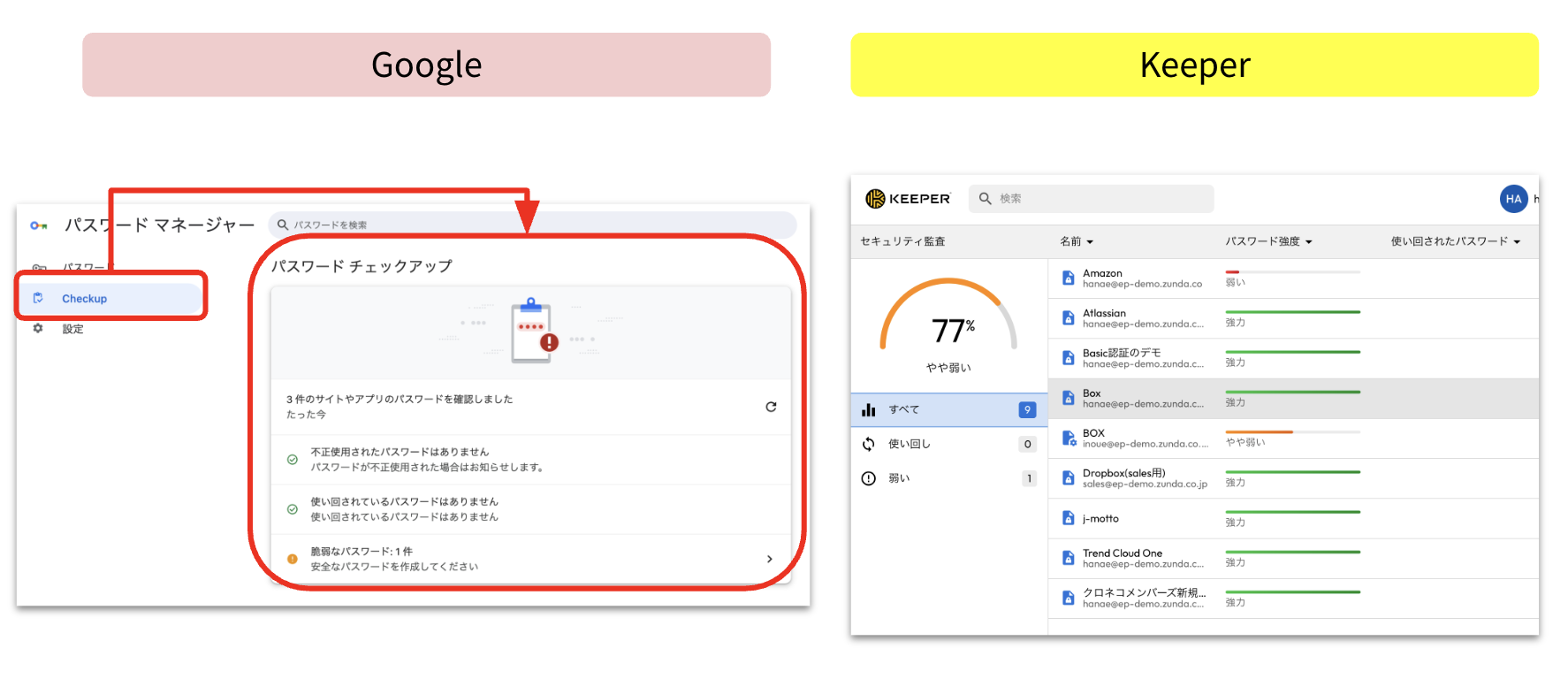 - Google も Keeper も、パスワードの安全性や使い回しがないか確認することが可能。