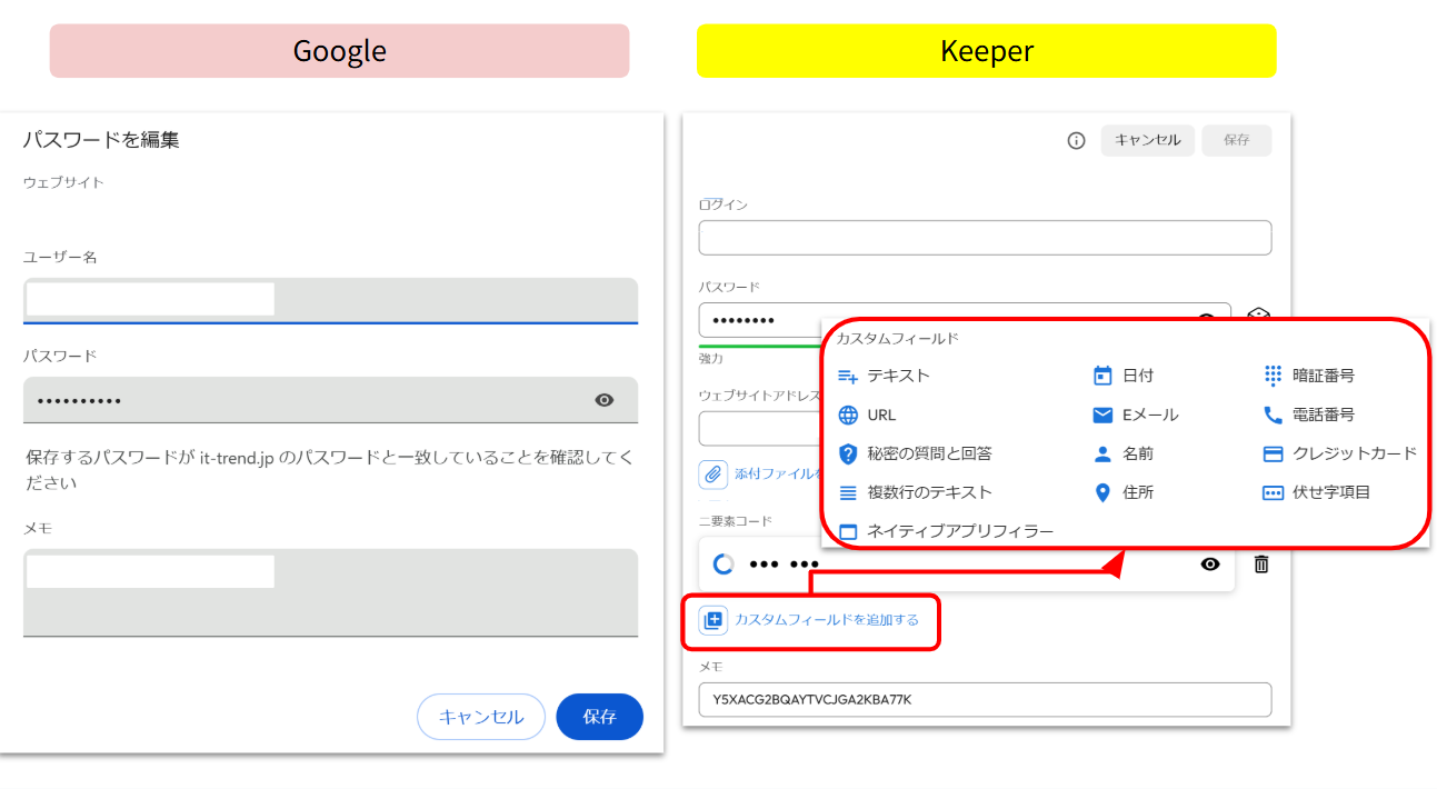 - Keeper は、それに加え二要素認証コードや、Webサイト独自の認証情報(会員NO.など)を保存することが可能。さらに、クレジットカード情報やSSH鍵など、様々な認証情報の保存が可能。
