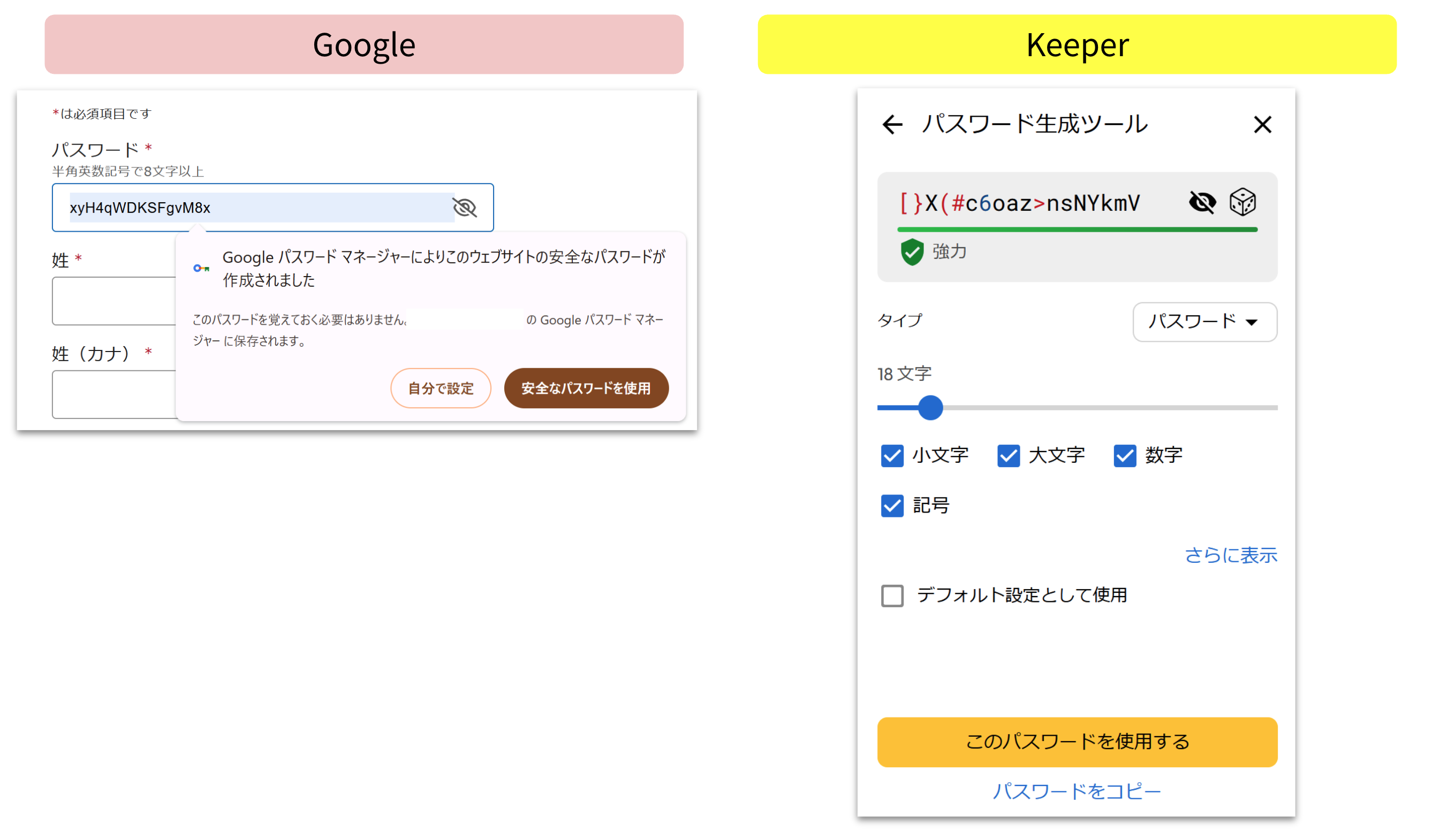- Google, Keeper ともにパスワードの新規作成を補助してくれます。