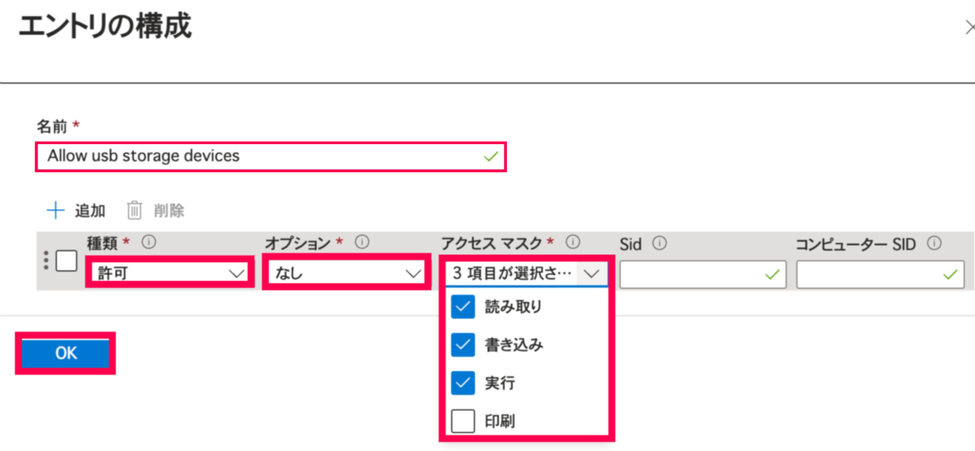 - 名前: 「SpecalRemovableMediaDevices」などわかりやすい名前をつける