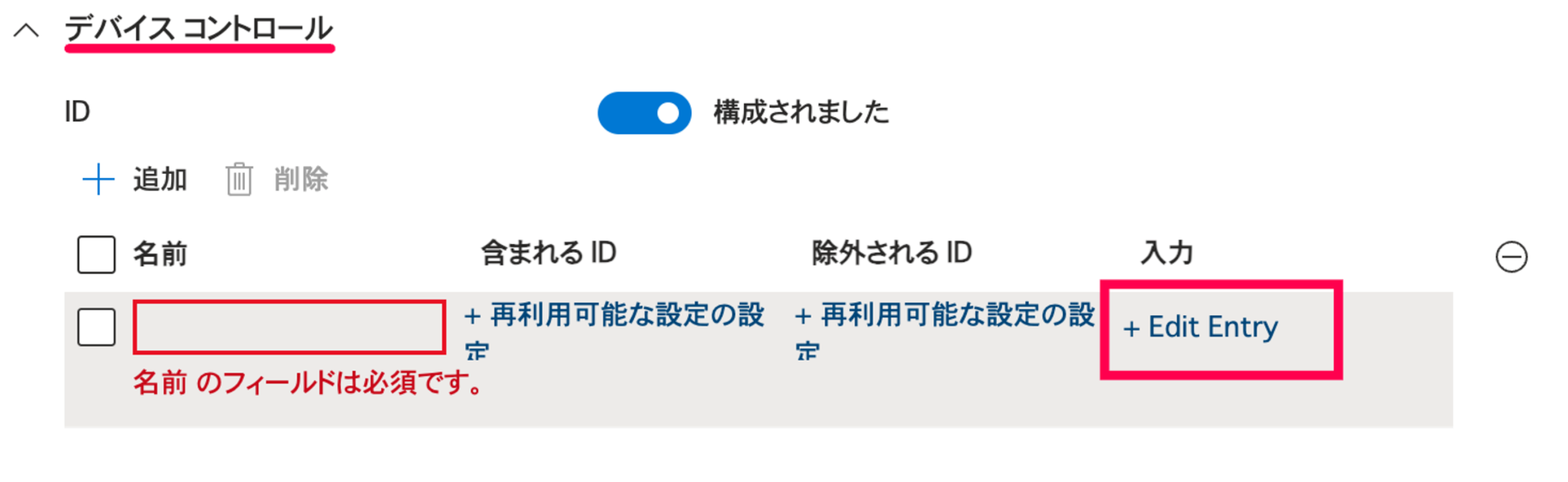 - 次に[+追加]をクリックし、追加された行にある [+Edit Entry]をクリック