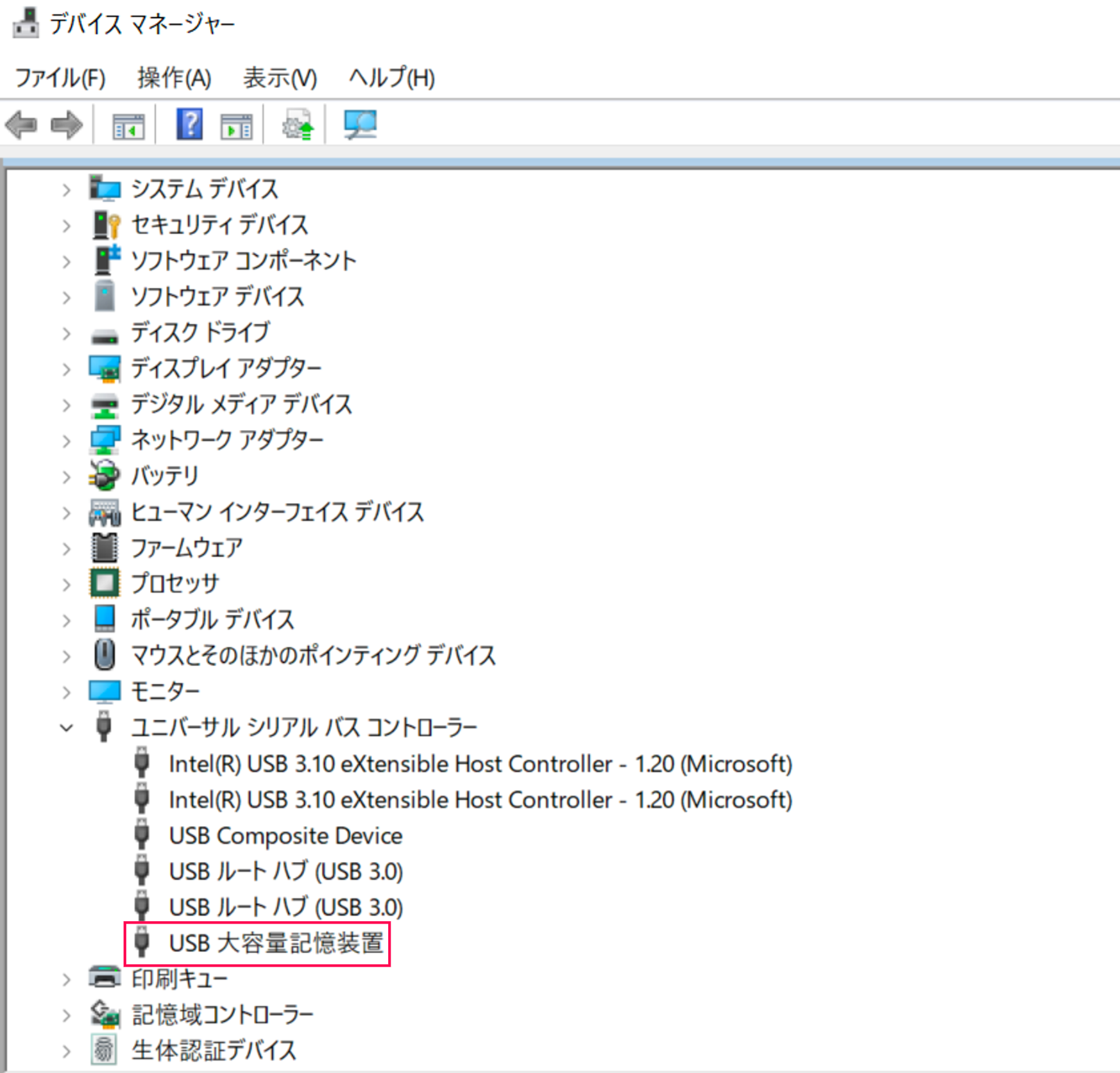 - 該当機器の[USB大容量記憶装置]にて右クリック > [プロパティ]を開く