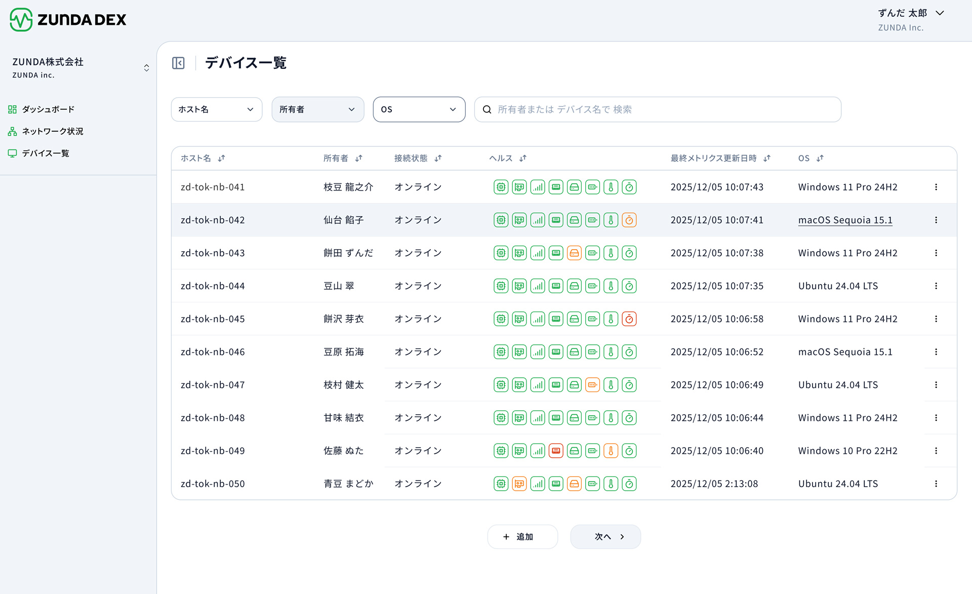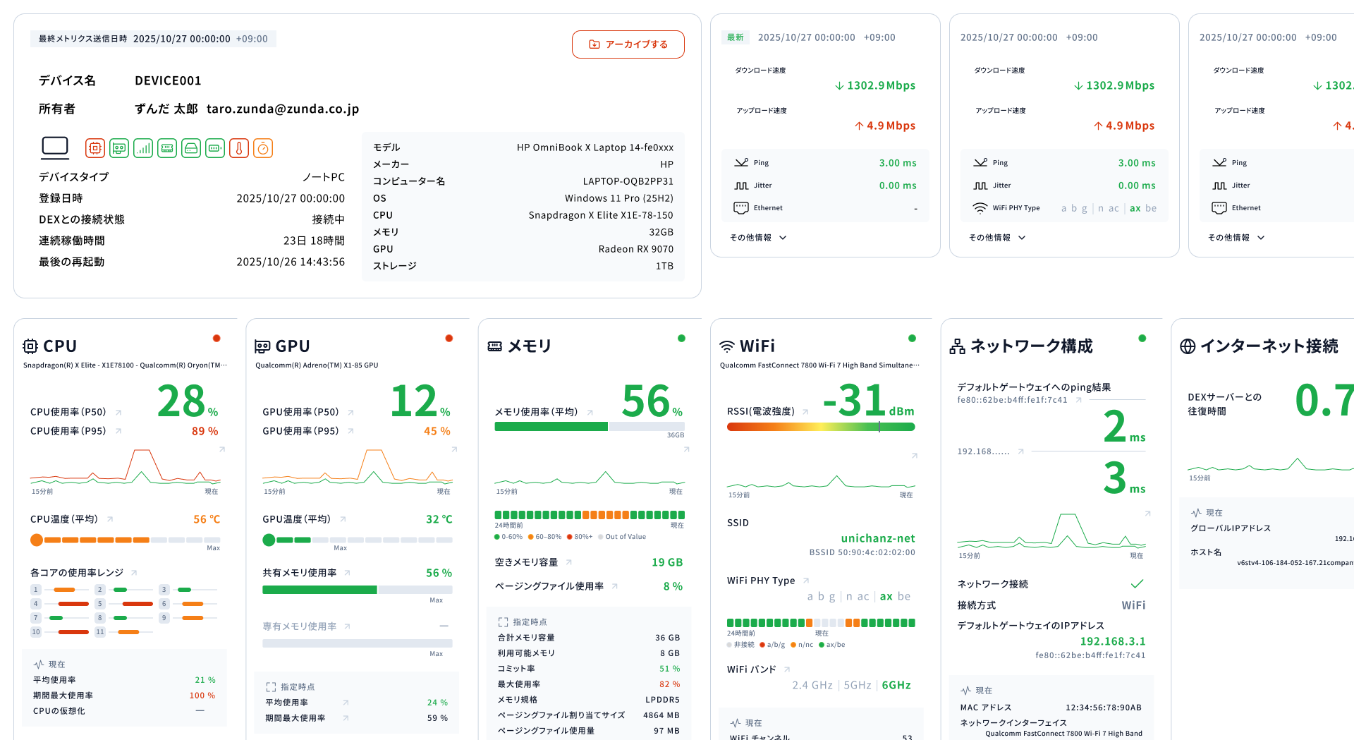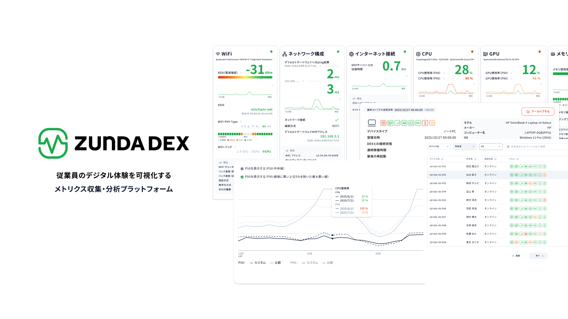 ZUNDA DEX は、従業員のPCやネットワークの状態をリアルタイムで収集・可視化し、「なんとなく調子が悪い」といったIT環境の課題をデータに基づいて解決へと導き、従業員のデジタル体験と生産性を向上させるメトリクス収集・分析プラットフォームです。
