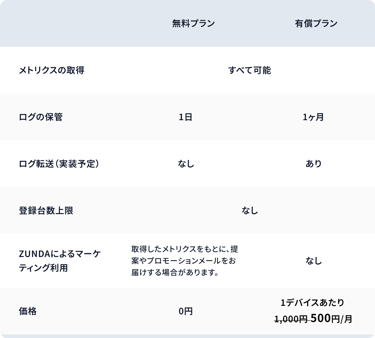 どちらのプランでもメトリクスの取得には制限がありません。有償プランでは、ログの保管は1ヶ月に延長されるのに加えて、今後リリース予定の外部ログ転送機能もご利用いただけます。無料プランでは、ログの保管期間が1日と短く、ログ転送機能もご利用いただけません。