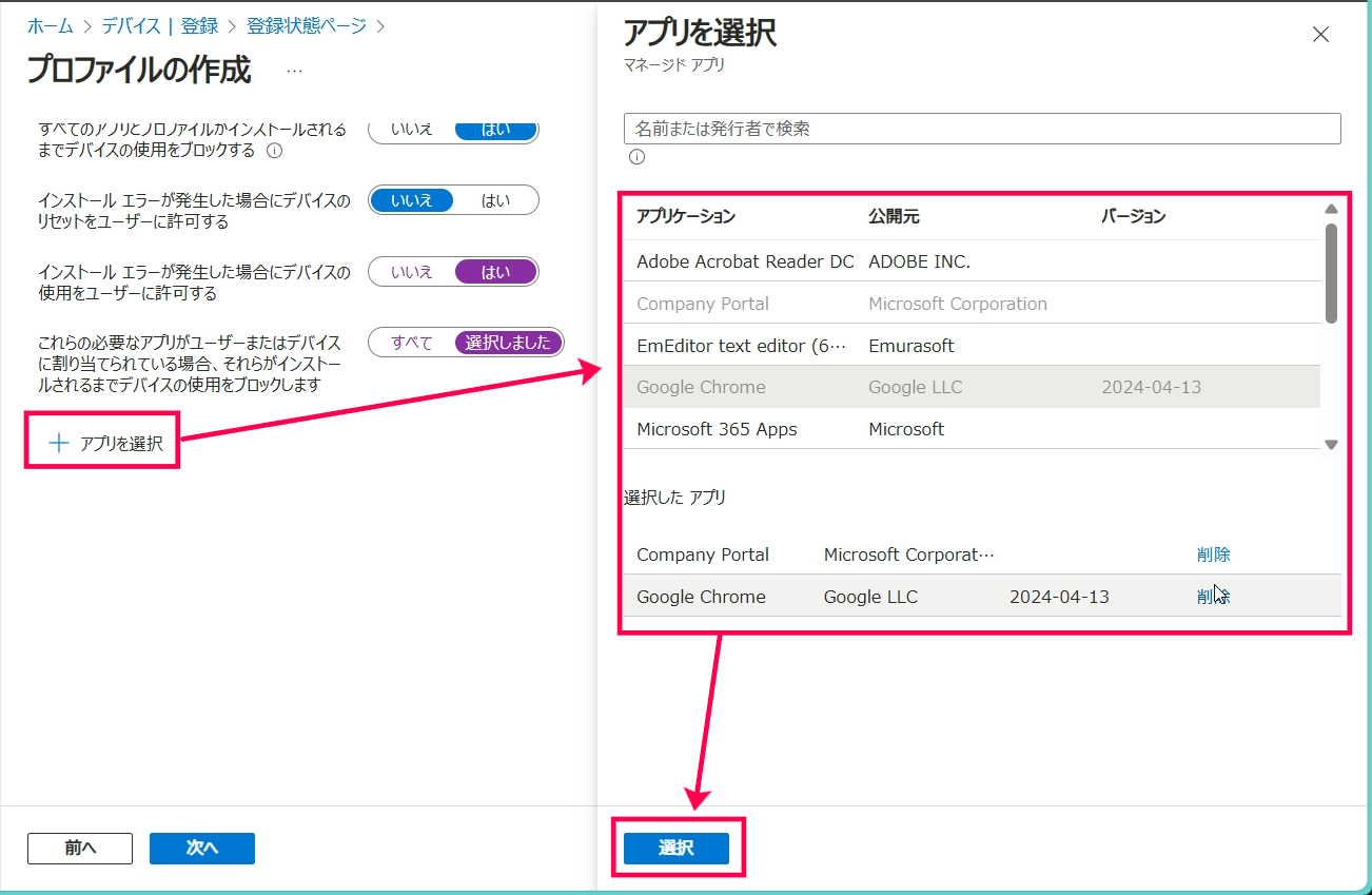 - エラーや想定外の項目があった場合、ESPの対象やアプリの設定/割り当てなどを見直してから再試行します
