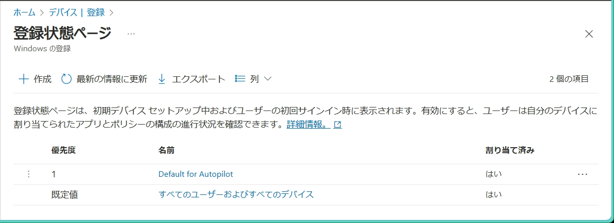 - Windows タブ > Windows Autopilot > 登録状態ページ を開きます