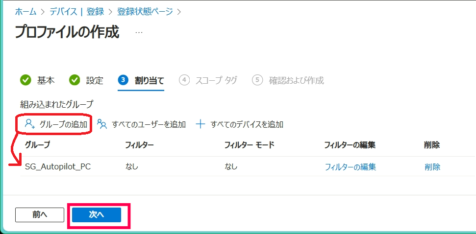 - 『割り当て』タブで [グループの追加] をクリックし、対象のグループを選択したら [次へ]